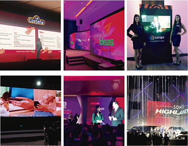 Pantallas led de proyección (interior y exterior), videoproyectores, audio, microfonía, iluminación profesional y ambiental, estructuras versátiles y dinámicas.
